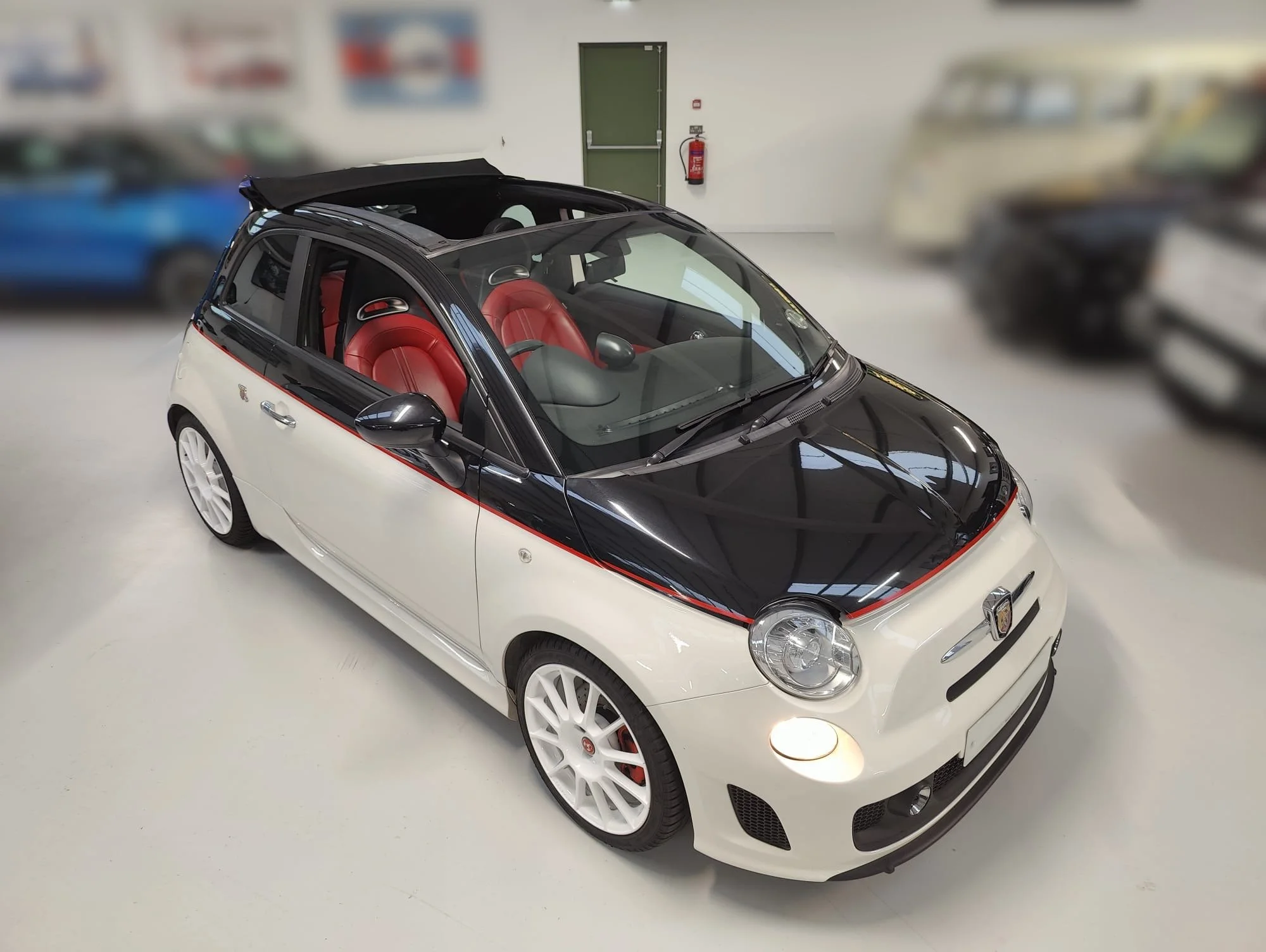 Inside, the car is fitted with a red leather interior with white contrast stitching, extending across the seats and door cards, along with metal pedals and Abarth-specific detailing throughout. The interior presents well, with all electrical items functioning correctly, including the electrically operated folding roof.