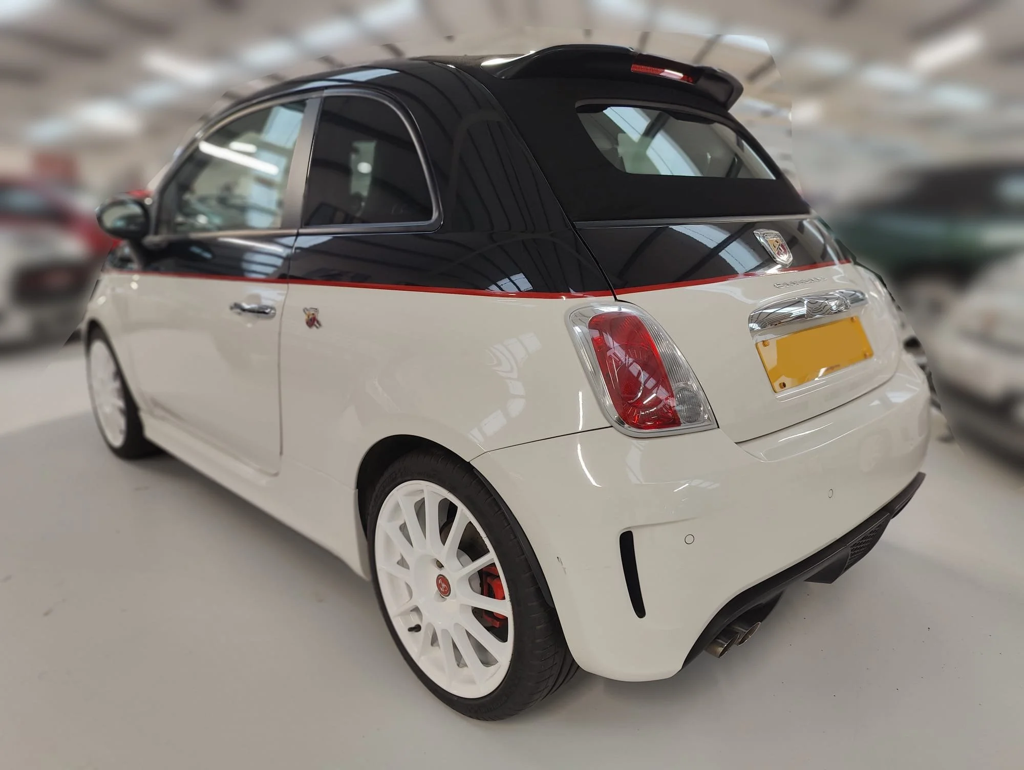 Finished in a black-over-white body colour with red exterior detailing, the car sits on model-specific white alloy wheels and features the EsseEsse performance package, including uprated brakes, lowered suspension, and increased engine output from the turbocharged 1.4-litre petrol engine, paired with a five-speed manual gearbox.